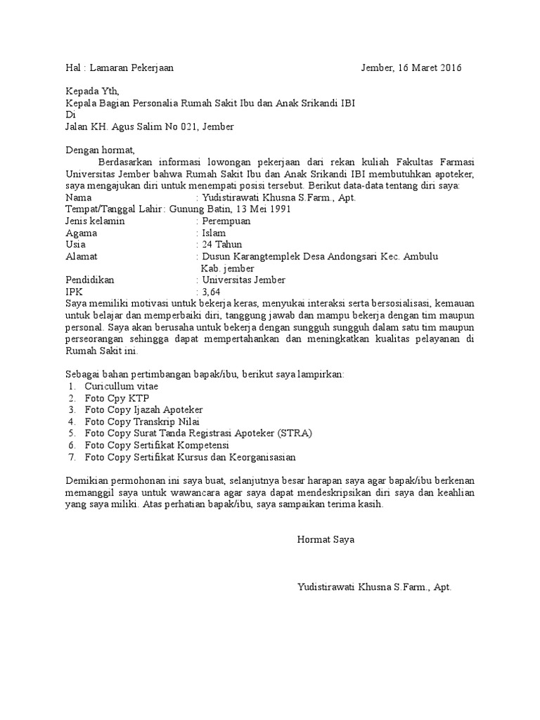 Contoh Surat Lamaran Kerja Lengkap Dengan Struktur Dan Teknik from loperonline.com Maybe you would like to learn more about one of these? We did not find results for: Check spelling or type a new query. Apoteker contoh surat lamaran kerja rumah sakit.